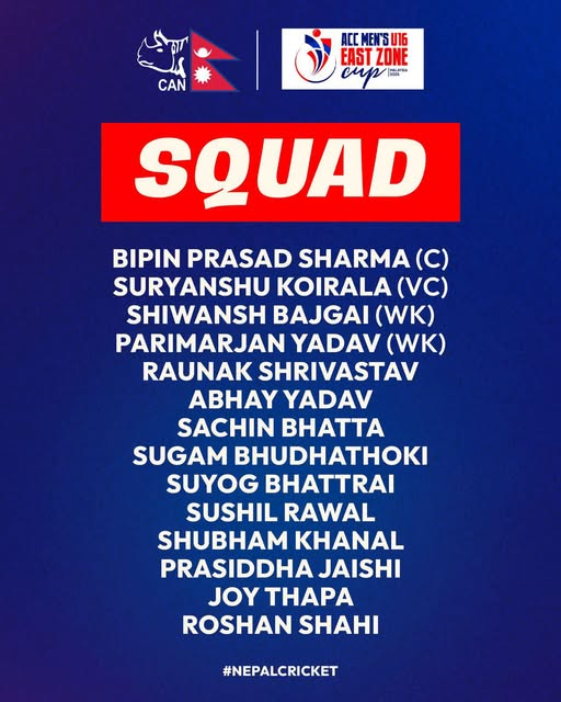 Nepal U-16 Squad is ready to compete in the upcoming ACC U-16 East Zone Cup 2025, which is set to begin on June 20 in Malaysia. The 14-member squad was officially announced with young spinner Bipin Prasad Sharma named as captain and Suryanshu Koirala as vice-captain.